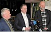 Fv. Jørn Eggum i Fellesforbundet, riksmekler Mats Wilhelm Ruland og Stein Lier Hansen i Norsk Industri er enige om årets lønnsopgjør i industrien. Foto: NHO